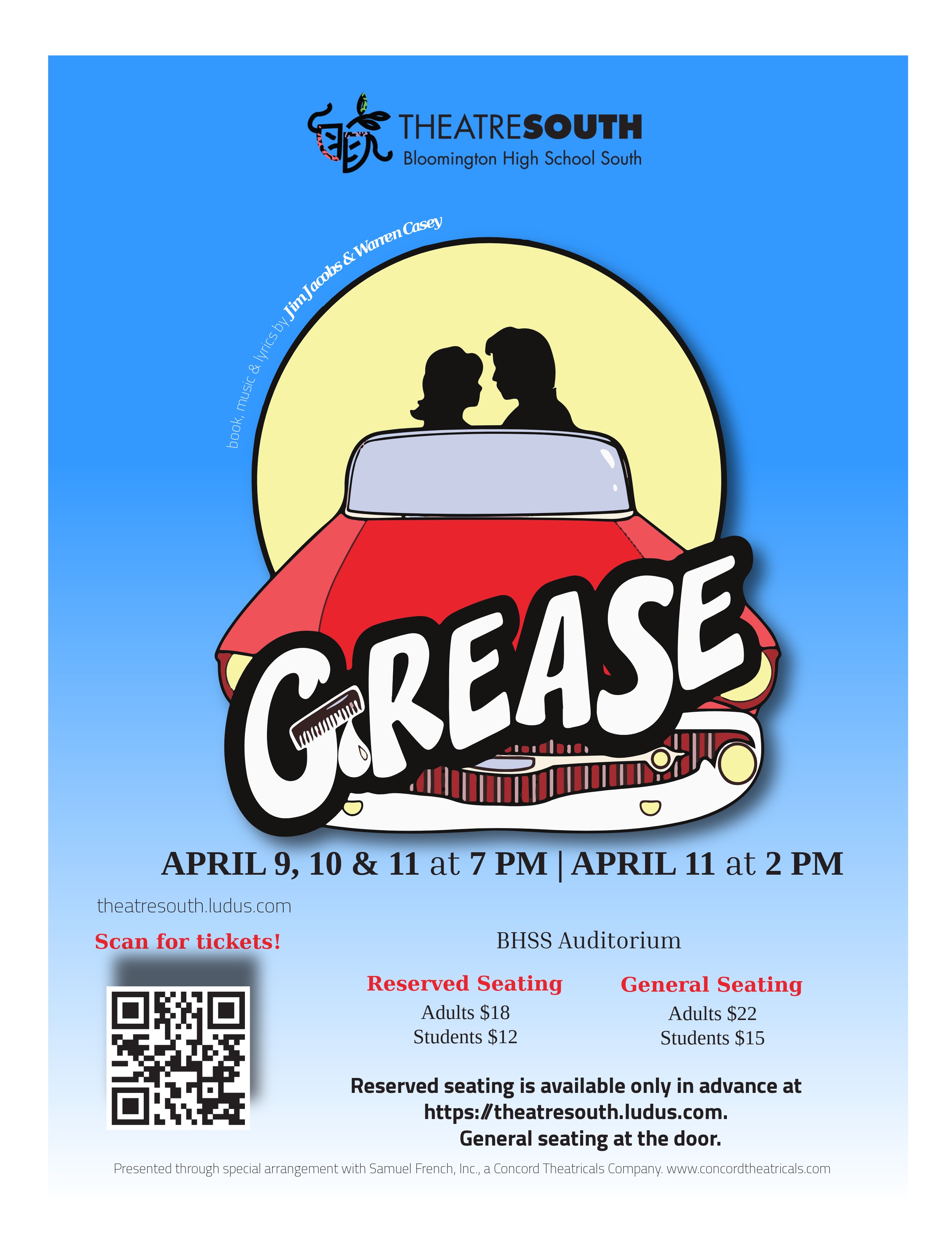 BHSS Theater South presents Grease on April 9th, 10th, and 11th at 7pm and April 11th at 2pm. Purchase tickets using the QR code or click this link https://www.bhsstheatresouth.com/grease.html.