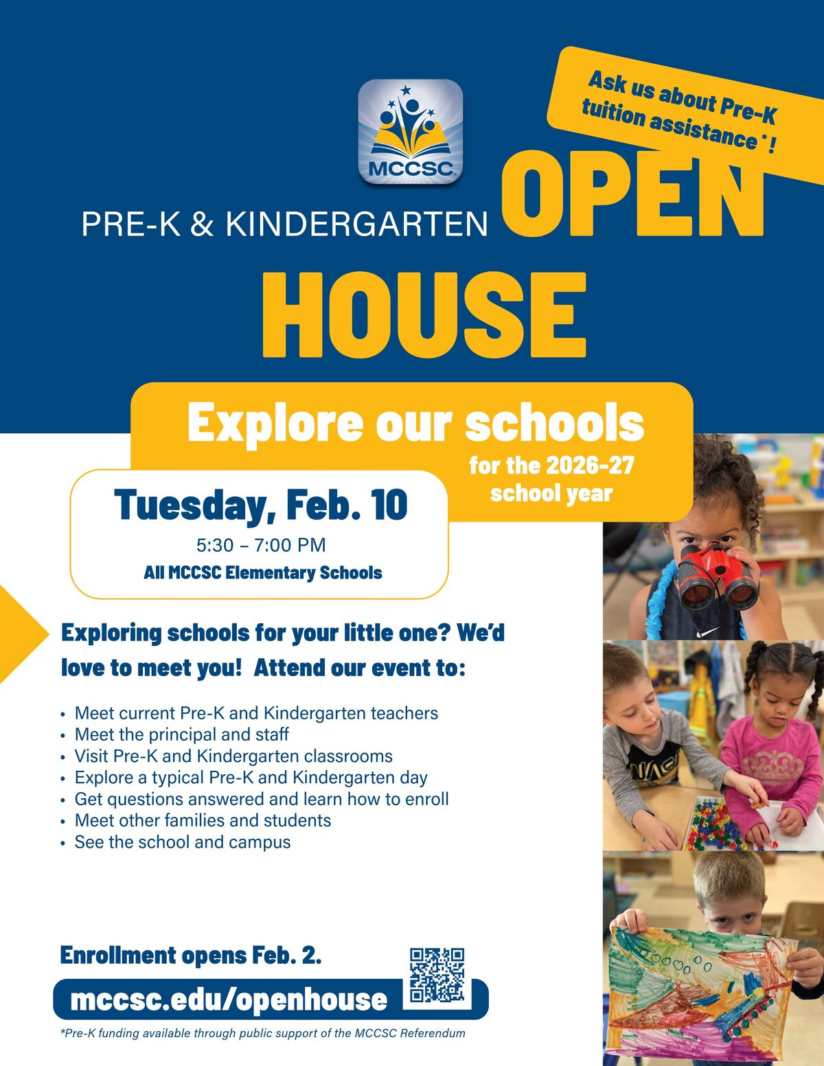 Pre-K and Kindergarten Enrollment for the 2026-27 school year opens February 2. Learn more about Pre-K and Kindergarten at an Open House on Tuesday, February 10 from 5:30–7:00 p.m. at all MCCSC ele...