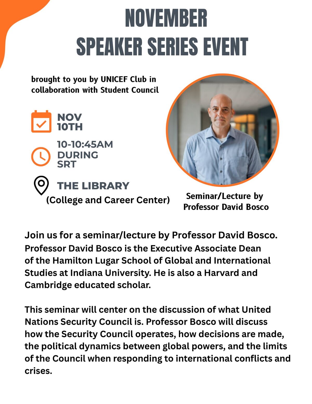 November Speaker Series Event Hosted by UNICEF Club in collaboration with Student Council. We are excited to announce that our November Speaker Series will feature Professor David Bosco, the Executiv. . .