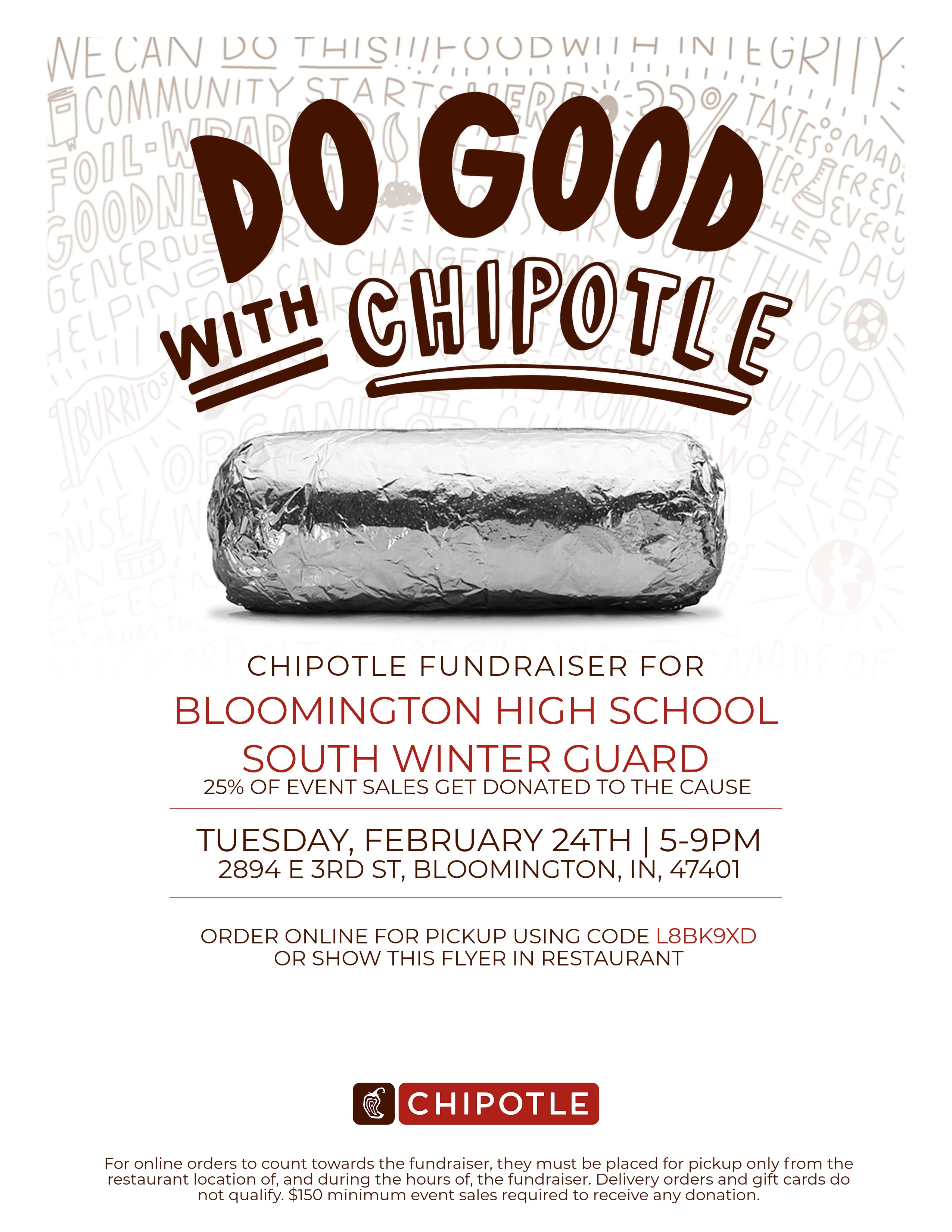 BHSS Winter Guard’s last Dine and Donate of the year is next Tuesday, February 24th at Chipotle from 5-9pm. Bring in a physical or virtual copy of the flyer or use code L8BK9XD when ordering online for Pickup and 25% of all sales will go to support our very own Winter Guard! Thanks for all your support this year!